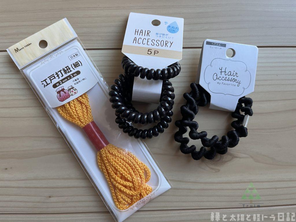 下のスパイラルヘアゴム?は真ん中に、伸ばしての広がれる余裕を持たせる長さにした紐を通して…
