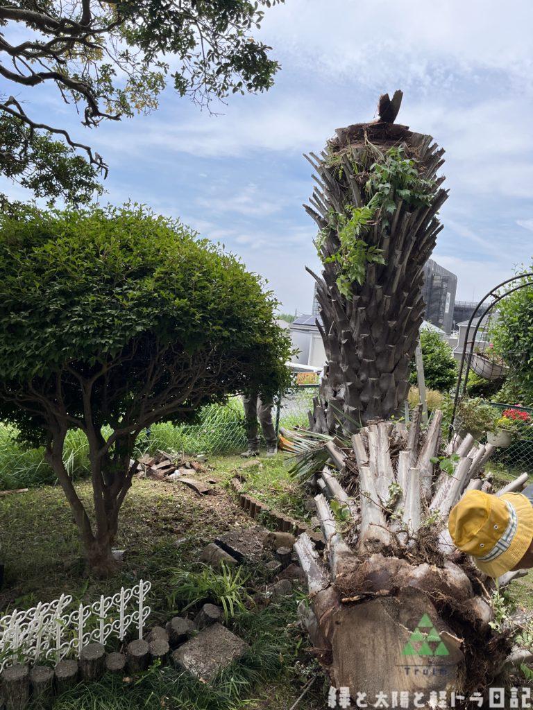 こーたさんの方もハシゴの上から、一番重たいチェーンソーを自分の目線より高い位置で真っ直ぐ入れるのは大変そうでした(^^;;繊維と水分たっぷりのヤシの木は本当に重かった💦