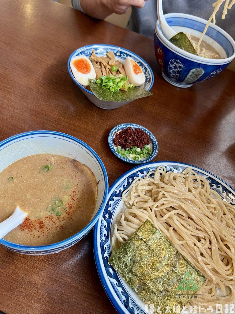 エビ辛しつけ麺🥺エビ辛しという赤いトッピングが別皿に乗ってきて、それを少しずつスープにとかして辛味を調整しながら食べました😋とろみのある濃厚スープにつるぷるの麺を絡めて食べる全てのバランスが良くて、最後は遠慮なくスープ割りもお願いして完食しました✌️